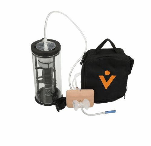 Students can accurately assess their patient’s chest tube by observing the tidaling and fluctuation of the closed chest drainage system on the wearable chest tube care simulator.