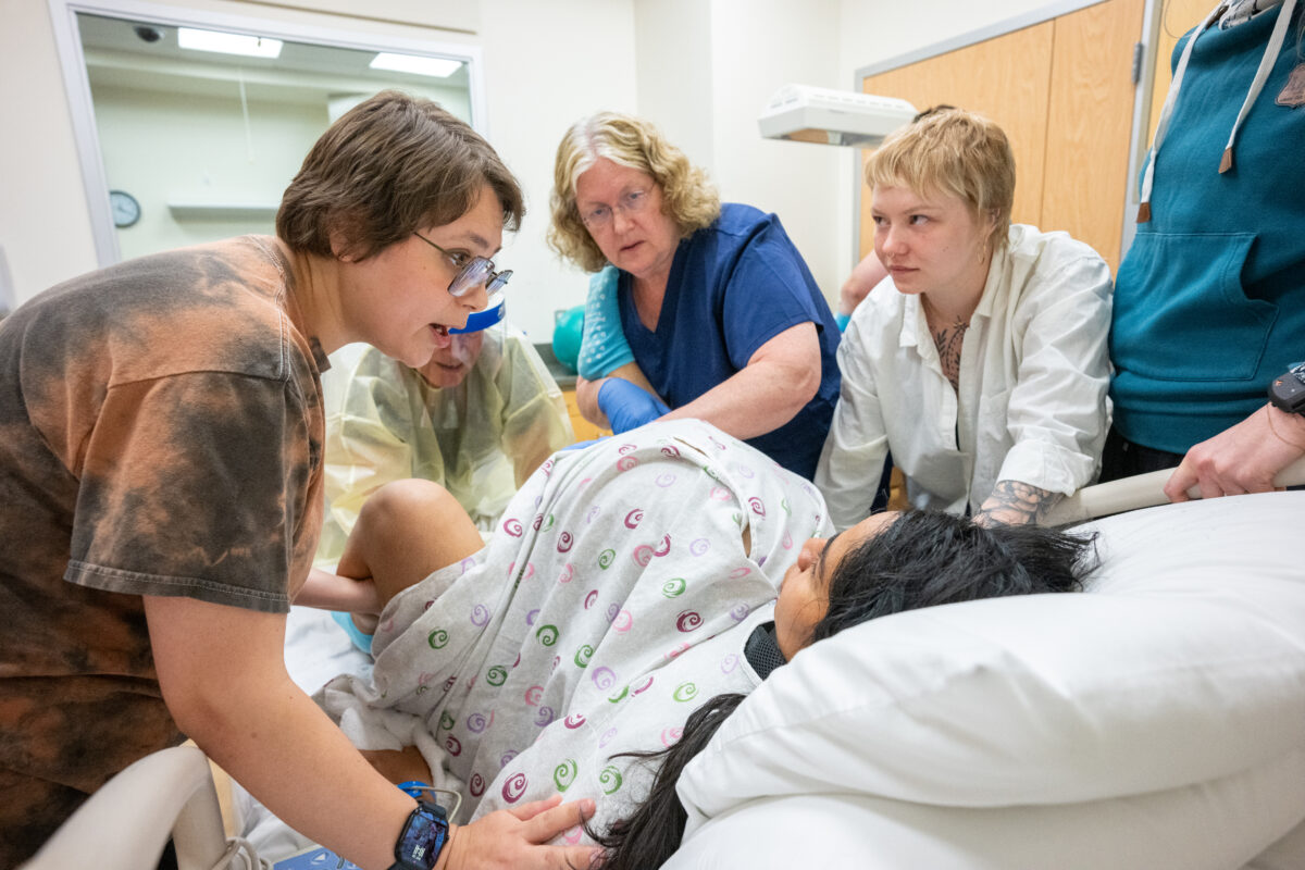 Student doulas Alexanderia Hand and Elizabeth Gittlein along with nurse role players help Bethany Alvarez, portraying the expectant mother, as UAA College of Health Simulation Center uses a wearable Avbirth Childbirth Simulation Device for the first time to help train students in the Full Embrace Doula Program, which provides comprehensive education, mentorship, and capacity-building to expand access to culturally attuned birth support in Alaska. (All photos by James Evans / University of Alaska Anchorage)